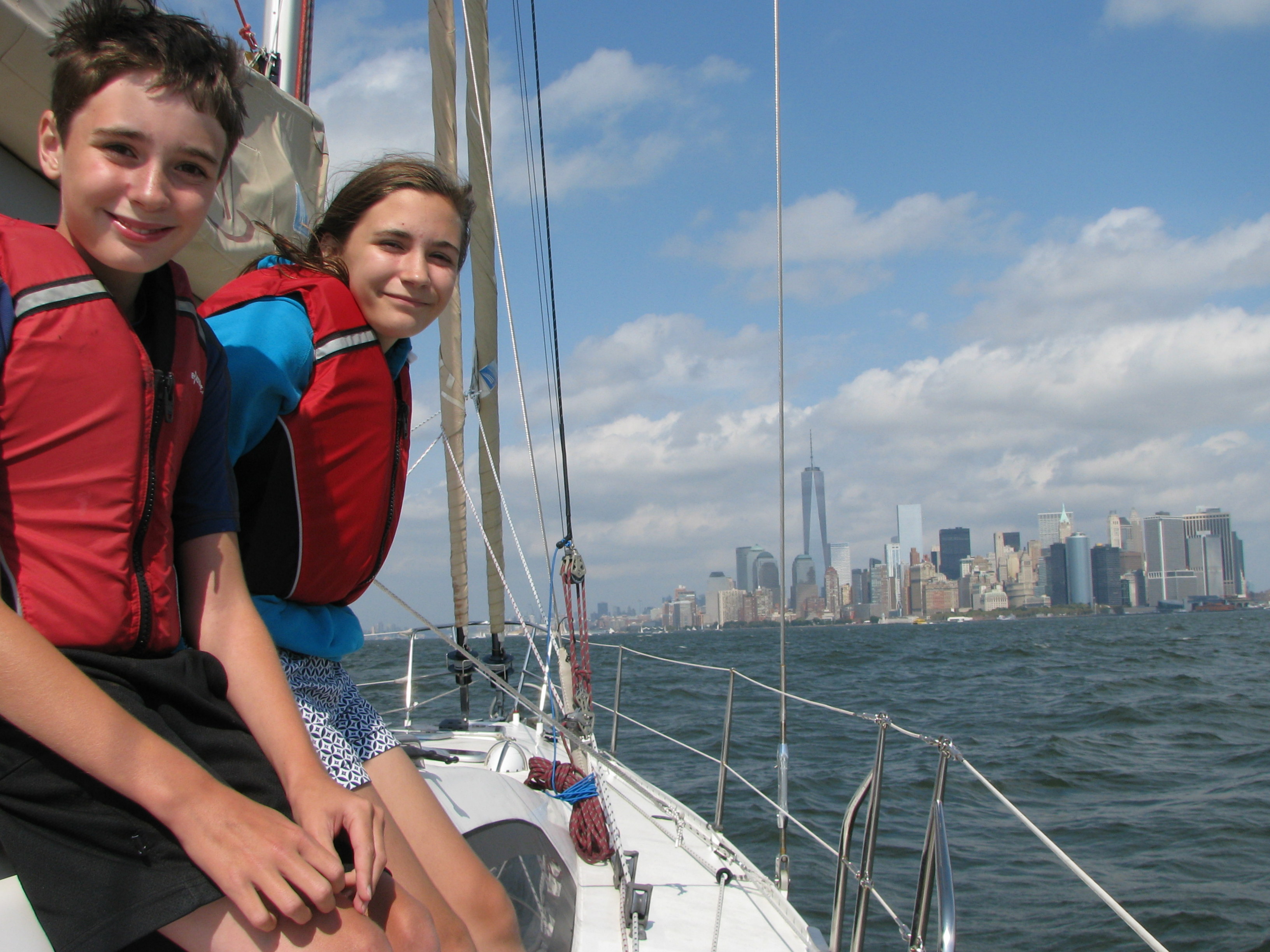 At sunrise on September 18th we woke to a crisp north breeze, perfect conditions to slip our mooring in Jamestown, Rhode Island and sail down the coast. Hot coffee and fleece warded off the chill. By afternoon we passed Race Rock and entered Long Island Sound, anchoring just west of the Connecticut River estuary. The next day a strong easterly breeze carried us to the Sand Hole, an anchorage on the New York side of the sound, near Oyster Bay. We entered this small cove via a narrow channel with 3 feet of water at mid-tide, dragging our centerboard over the gravel bottom. Once inside we enjoyed the tranquility of marshes, wildlife, and a beautiful beach – a stark contrast with the skyline of Stamford visible just across the sound. That evening we celebrated Megan’s 11th birthday.