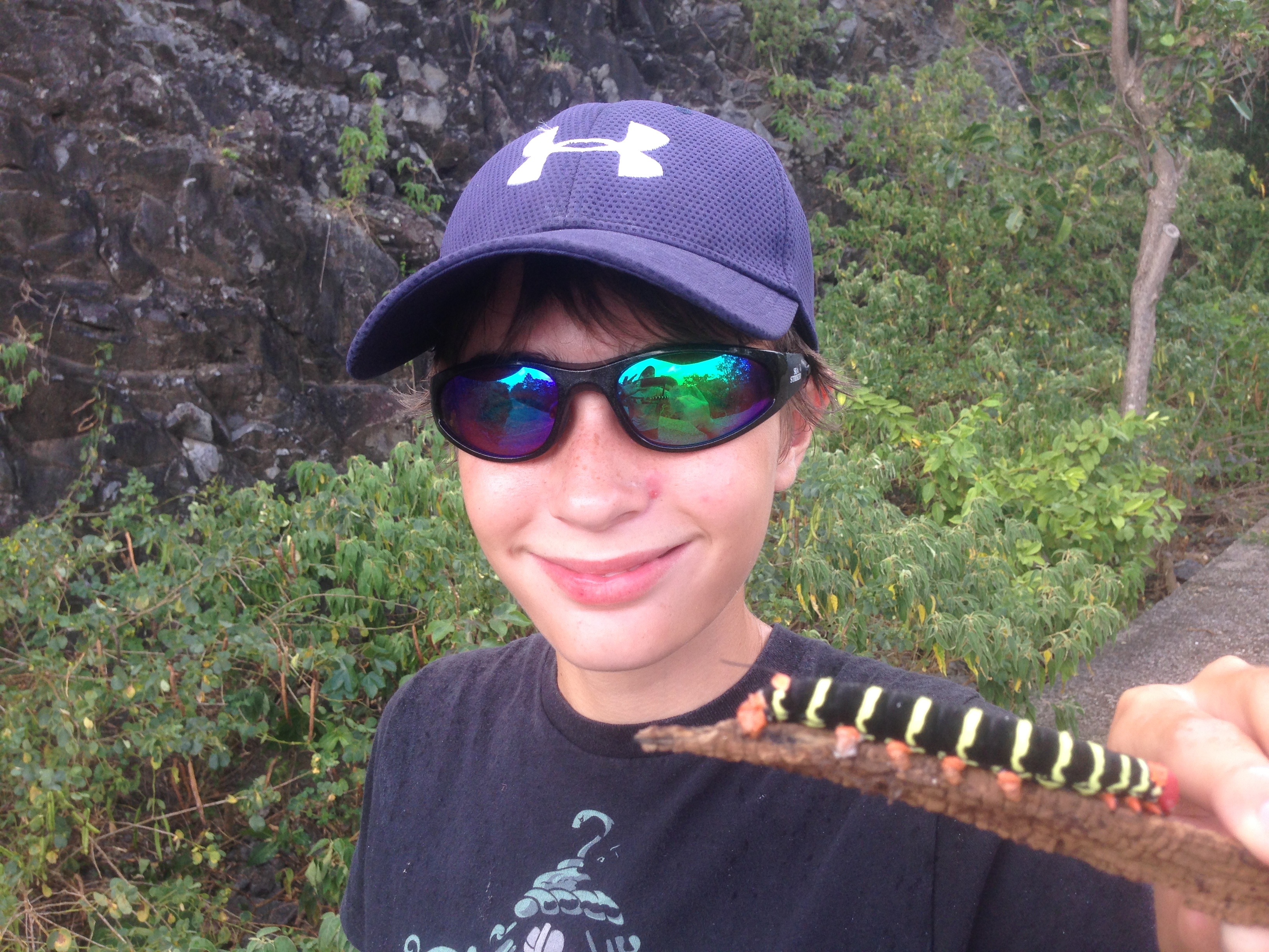 A caterpillar we discovered on a large evergreen with sappy, white milk, beautiful white flowers and green-bean-like pods.