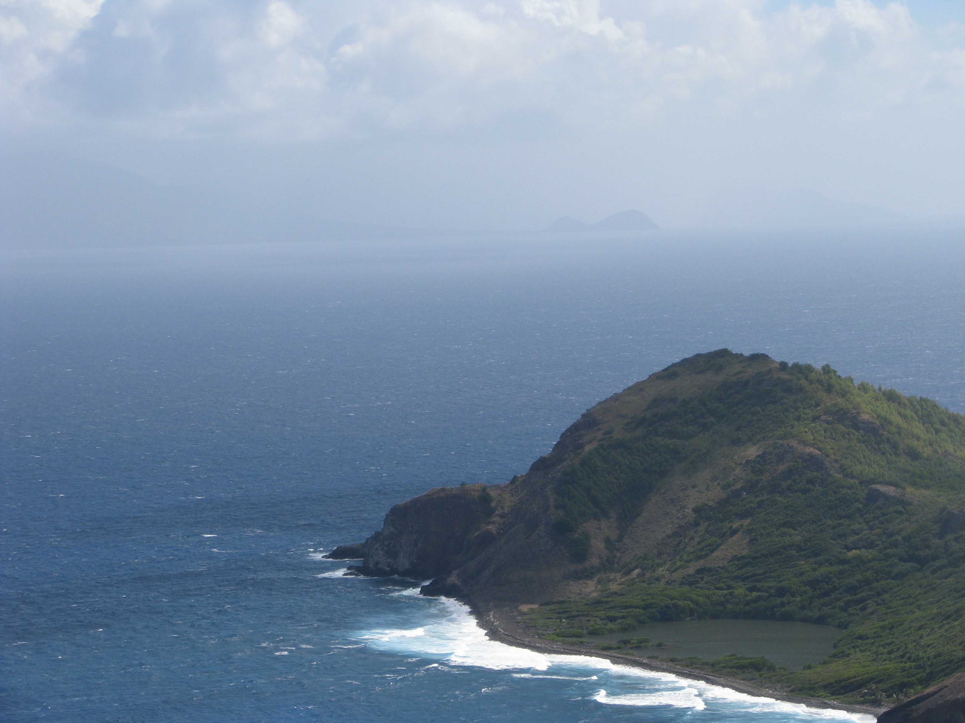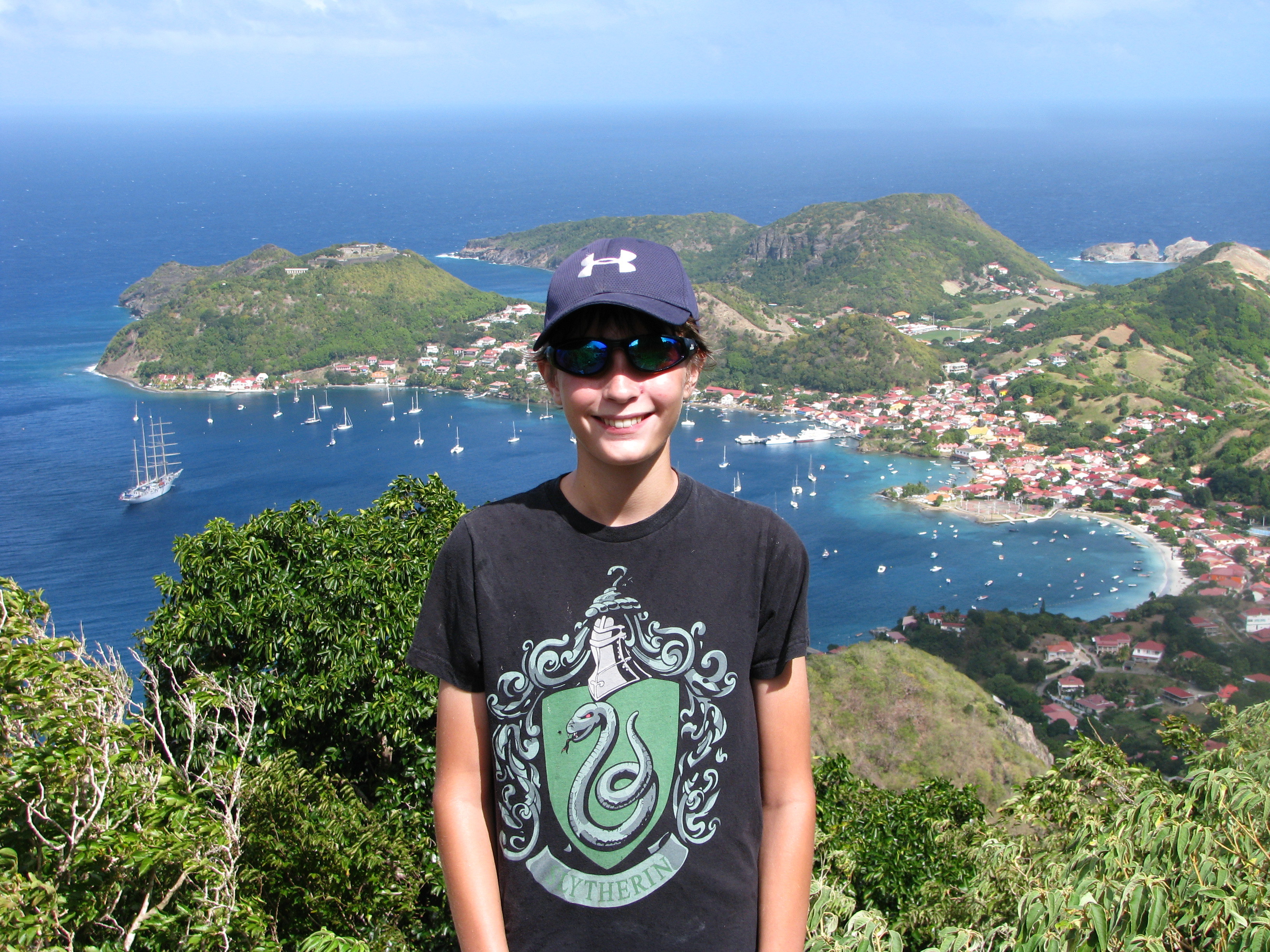 Owen above the harbor at Anse Bourg. Fort Napoleon sits on the hill above his right shoulder, and Strider just above his left.
