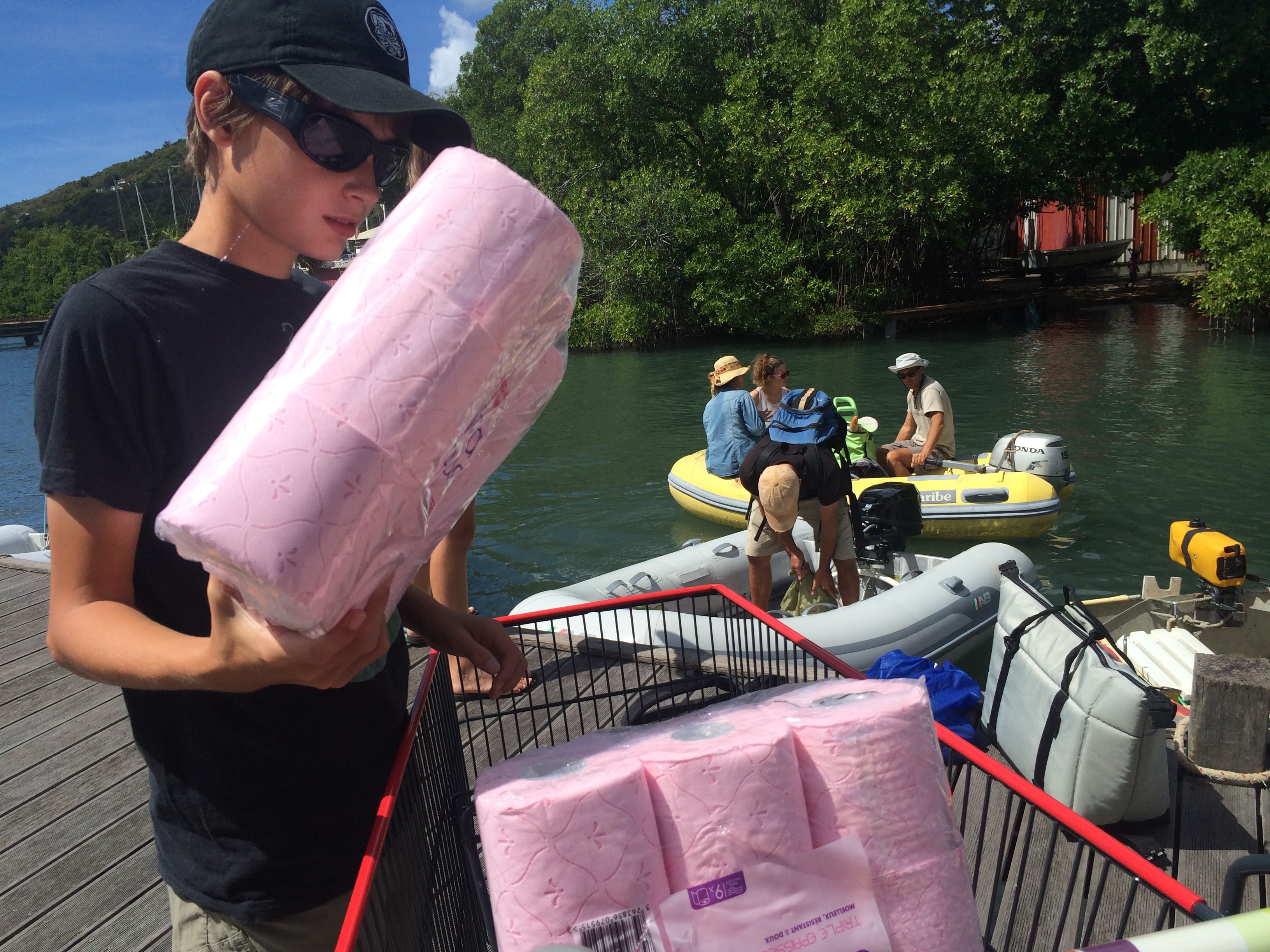 Owen loads the dinghy at the supermarche.  French markets are strictly BYOB (bring your own bags).  Our freezer bag keeps cold stuff cold until we return to Strider.