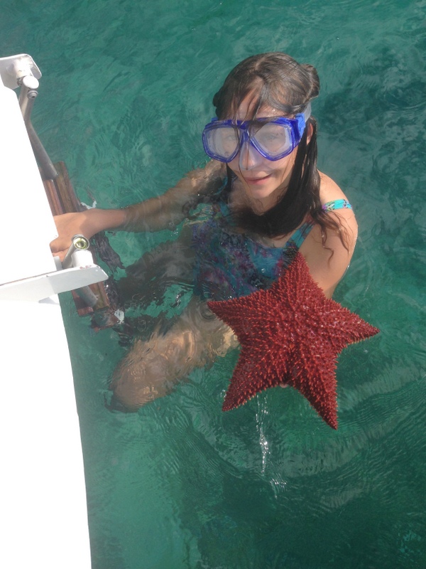 We took advantage of Strider’s 3′ draft to tuck inside the mooring field, setting the hook in 6-7 feet of water over sand and eel grass. Megan seized the opportunity to scour the bottom for sea life. She surfaced with excited reports of turtles and moray eels, and she held aloft urchins and starfish for all to see.