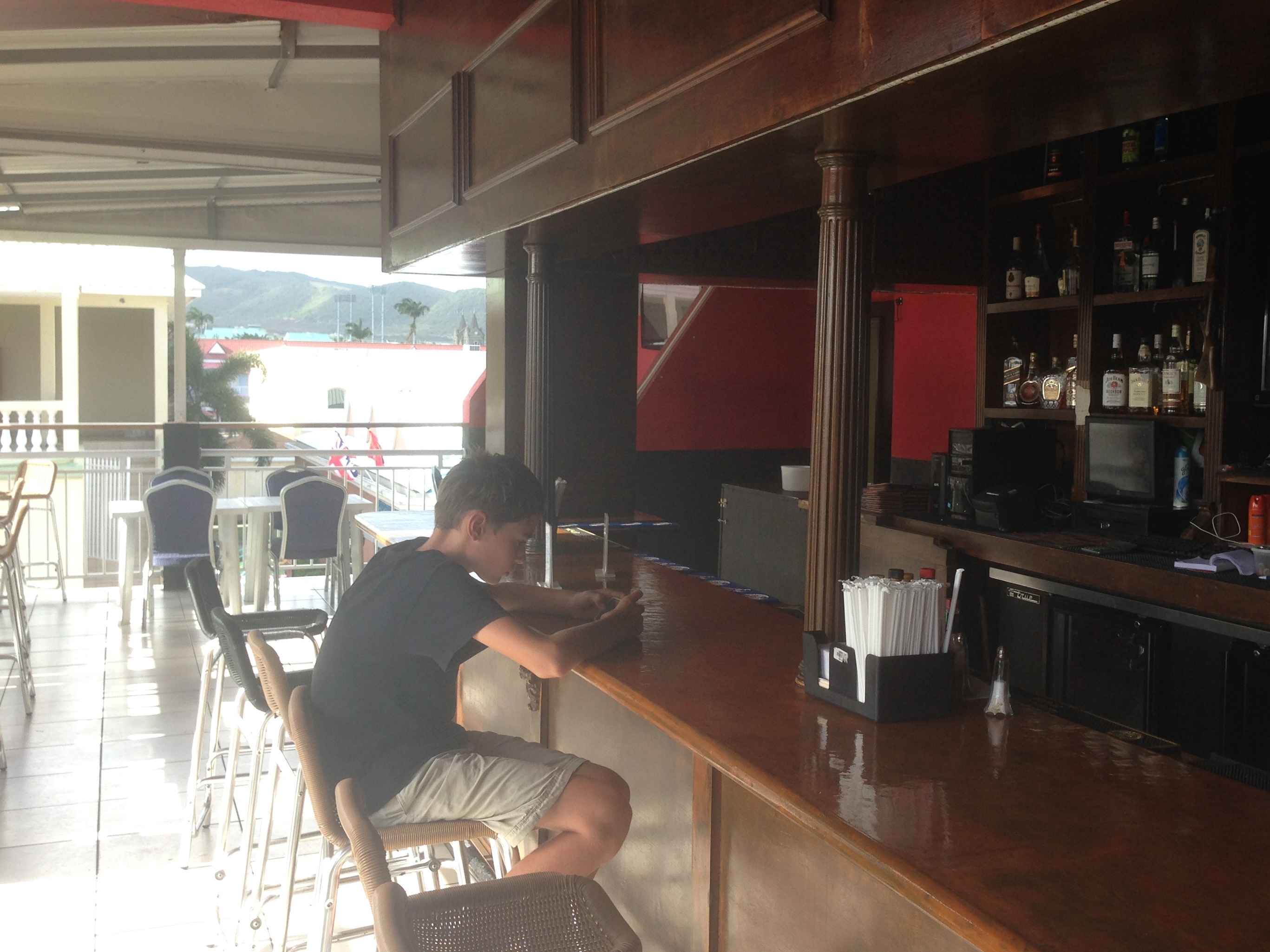 Owen at Bar Published April 28, 2015 at 2734 × 2050 in Montserrat: life is not always a beach Owen hits the bar for a ginger ale and some Wifi