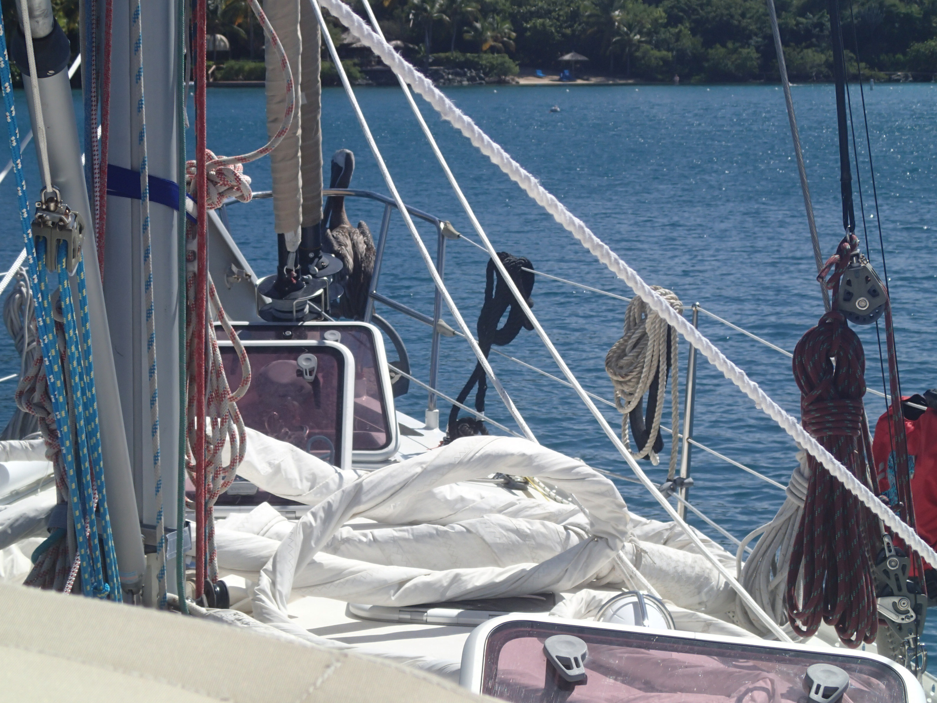 Jerk pork tenderloin with baguettes for Christmas dinner, and chocolate croissants for breakfast! We are fully enjoying our first visit to the French Antilles. Deshais is a colorful and bustling little village stretched out along the eastern shore of the anchorage, which is surrounded on three sides by verdant mountains with nice snorkeling along the northern headland. Colin took a year of French in college, but Kathy Parsons’ French for Cruisers has become the family talisman. We take it with us wherever we go, and we are all practicing. Au revoir for now.