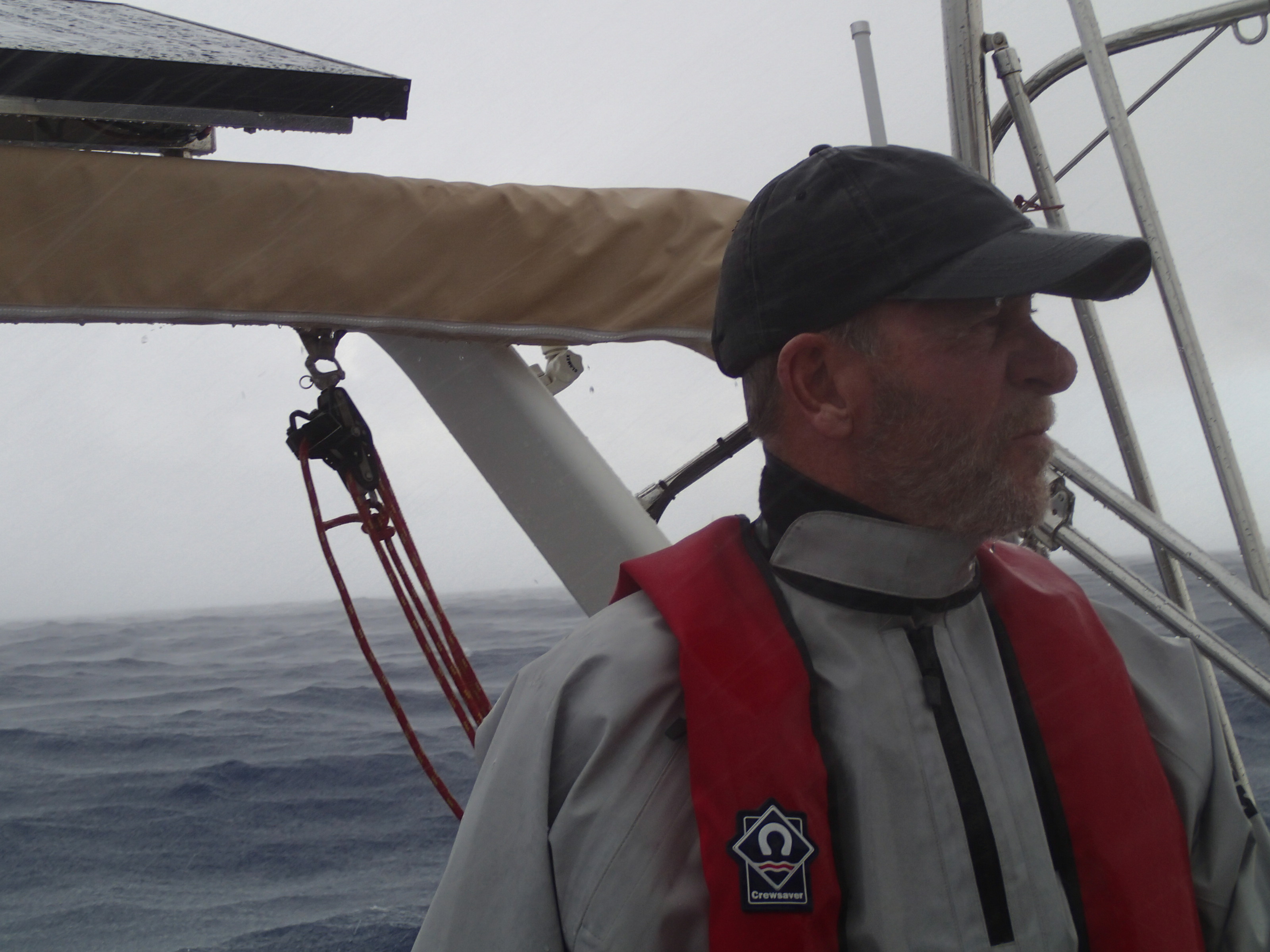 For the next two days we headed SSE, remaining west of a tropical trough with widespread squall activity. At times we made good progress by skirting the edges of rain squalls, but for the most part the winds were light or on the nose. Becalmed on November 5th we swam in 78 degree water, and we grilled tuna steaks on the stern. Early the morning of November 7th the wind finally backed to WSW and filled, and with the trough dissipating we set an easterly course. We did not want to get stuck below the rhumb line when the easterly trade winds filled, which would necessitate beating into wind and waves.