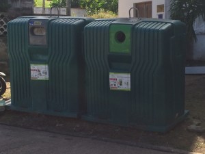 - Recycling bins (plastic/cardboard on left, glass on right)