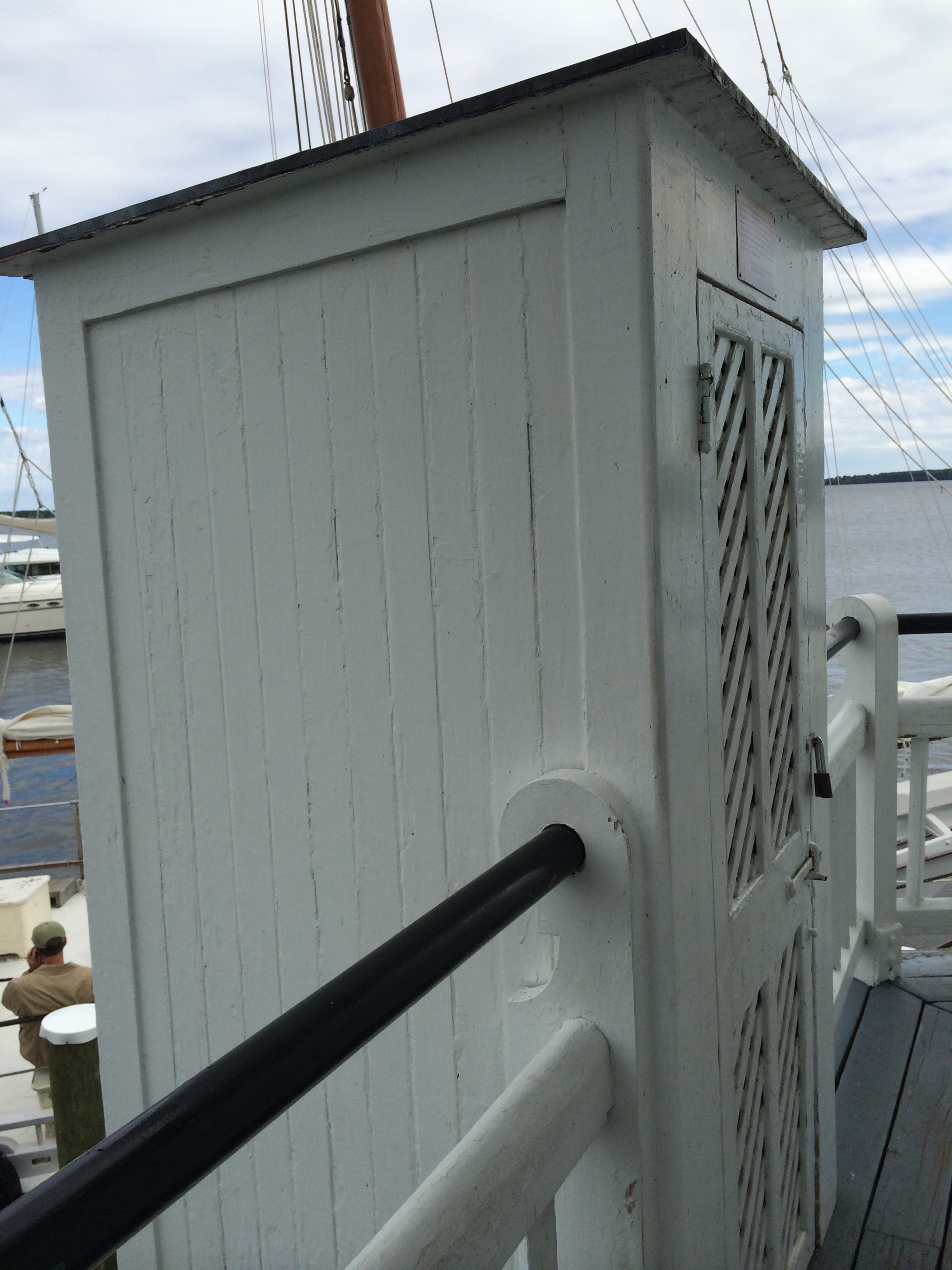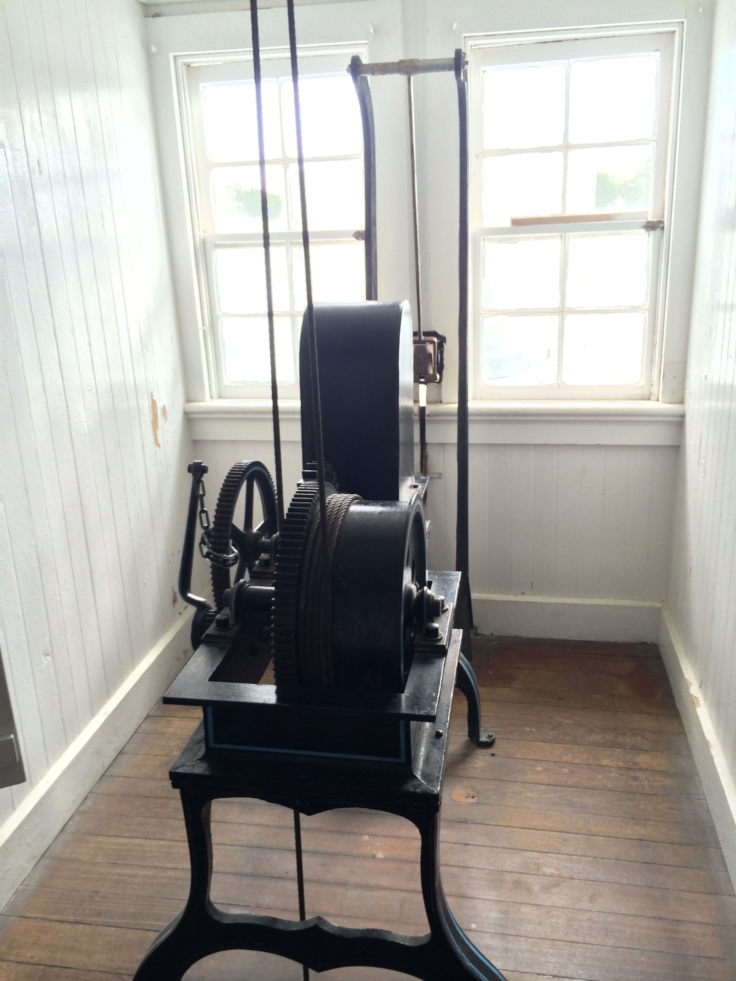 I went back up to the top level with my feather duster and cloth to clean the light’s lens. I returned the cleaning supplies to the fogbell room. I went back down the stairs to fetch my paint bucket and brush, then once again returned to the fogbell room and proceeded to paint the wall where it was starting to chip.